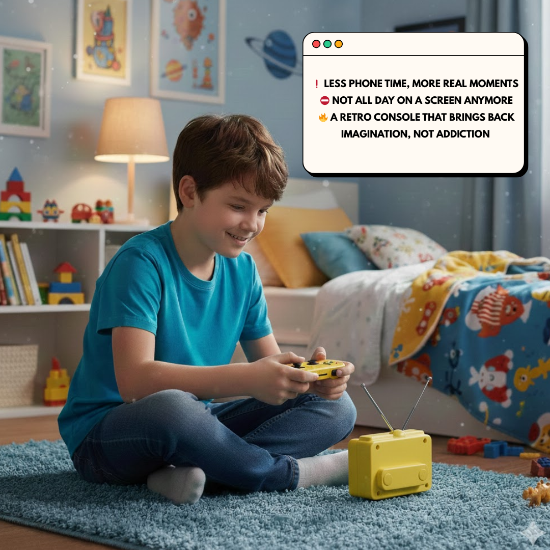 No passwords, no downloads, no endless updates. Just plug in and play instantly. A simple, safe, and nostalgic way to entertain kids and adults without relying on a smartphone.